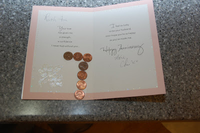 This past week Chris and I celebrated our 7th wedding anniversary! I am so lucky to have married the most wonderful man in the world! Here is a photo of the card that he bought me. Apparently the gift for your seventh anniversary is "copper"....hence the seven pennies that he glued to my card!